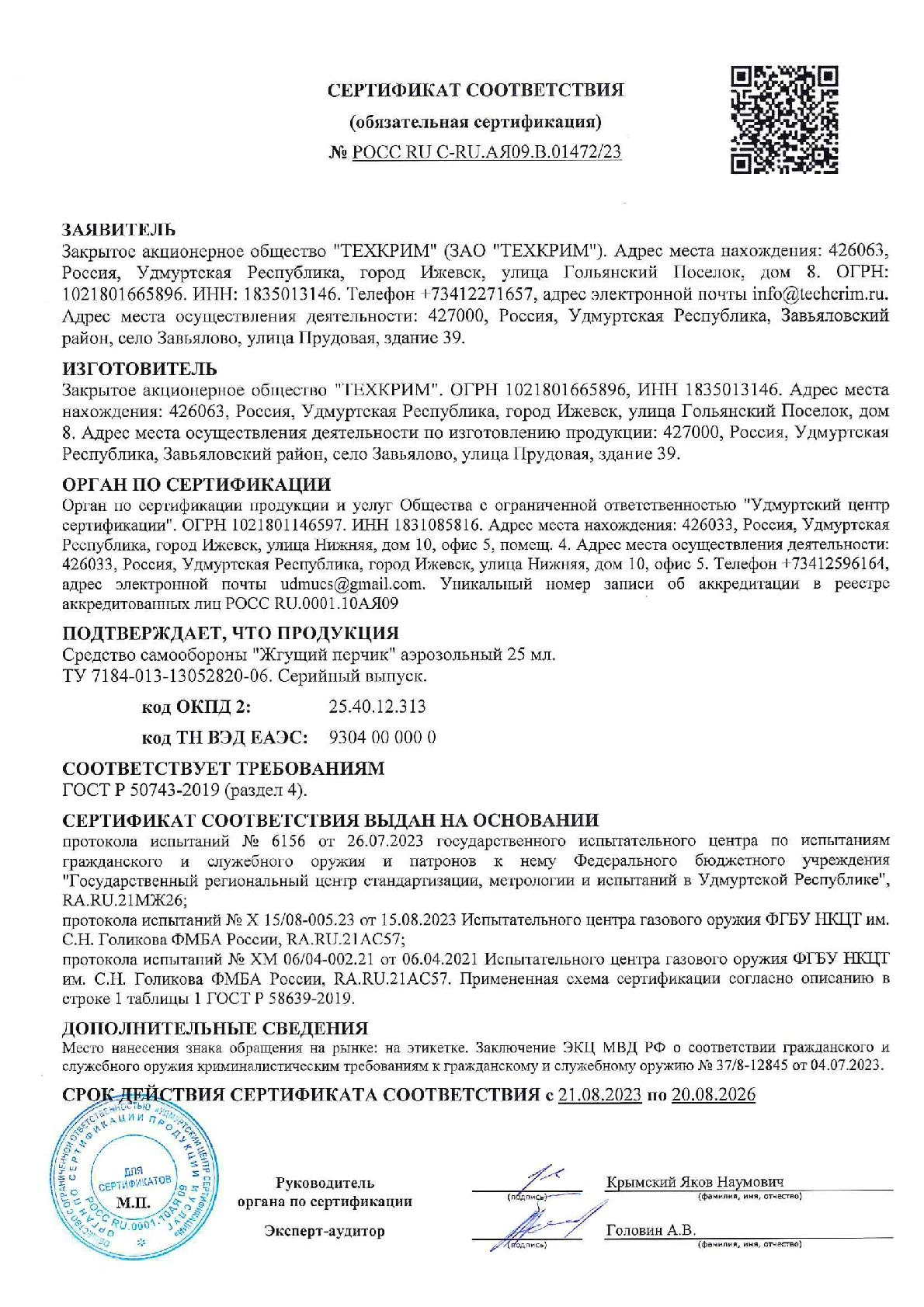 Слезоточивые вещества (ирританты): — масса вещества C (суммарное содержание капсаициноидов) 200 мг (концентрация 0,9 %)